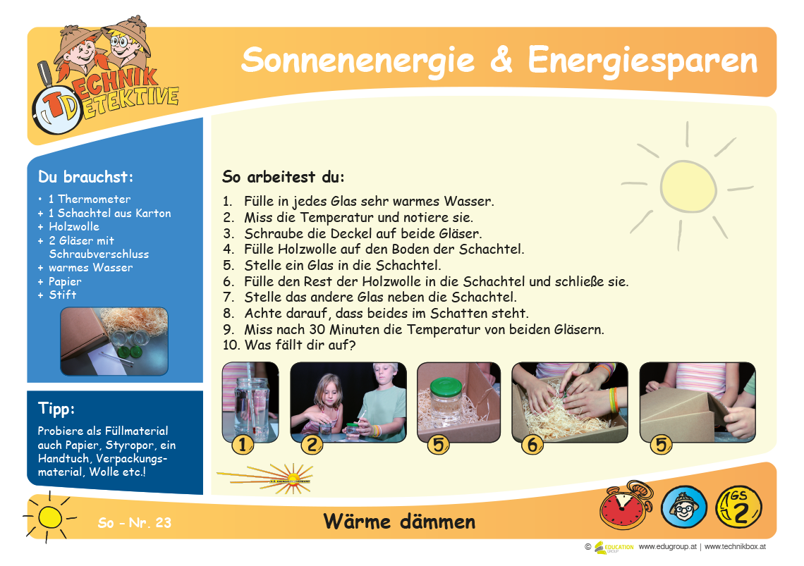 Holzwolle ist ein Material, das ein schnelles Auskühlen oder Erwärmen des Wassers verhindert. Dieses Material leitet die Wärme schlecht. Das Glas neben der Schachtel ist ungeschützt, deswegen kühlt das Wasser in diesem Glas im Schatten schneller ab.