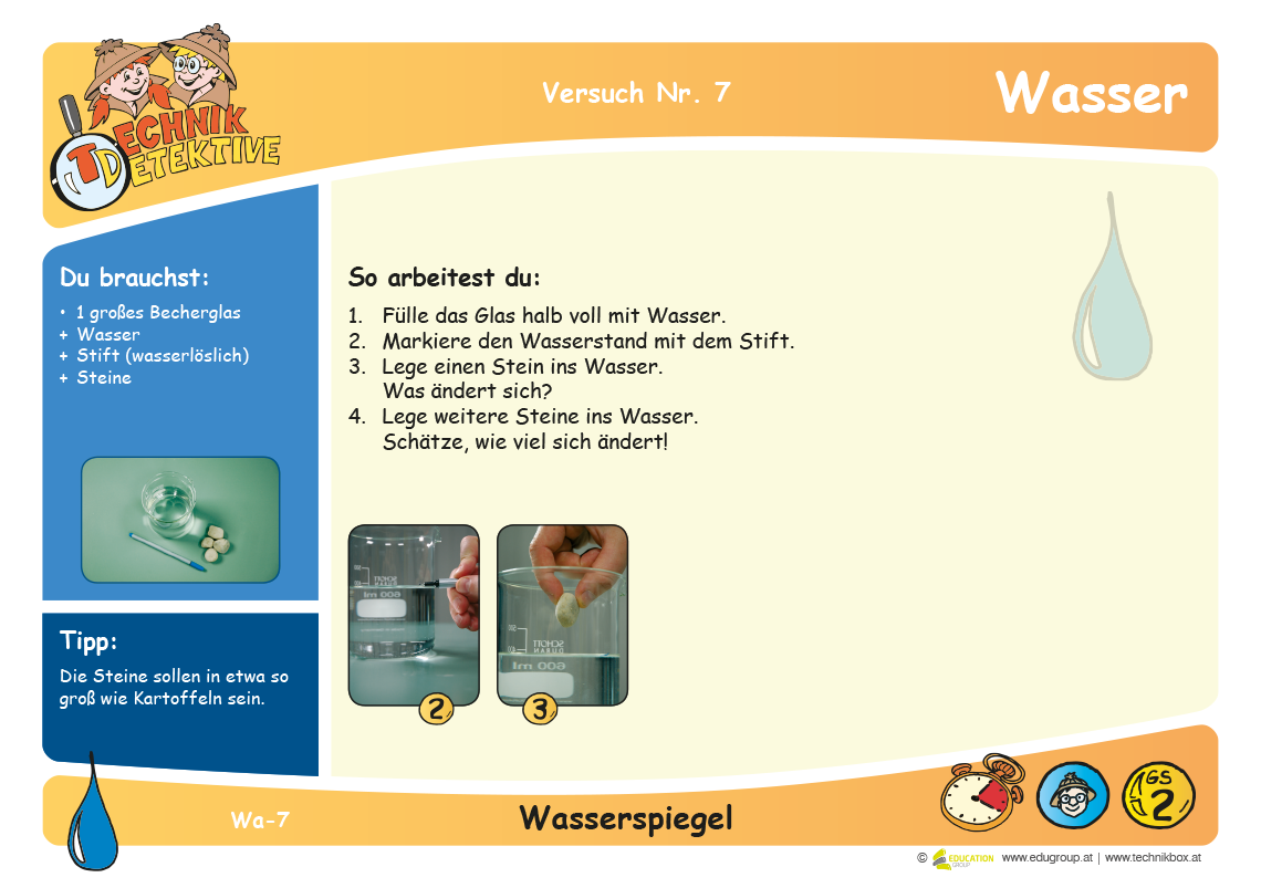 Legt man Gegenstände ins Wasser, so steigt der Wasserstand. Gegenstände, die ins Wasser eintauchen, brauchen Platz. Der Wasserspiegel steigt, weil der Körper Wasser verdrängt.